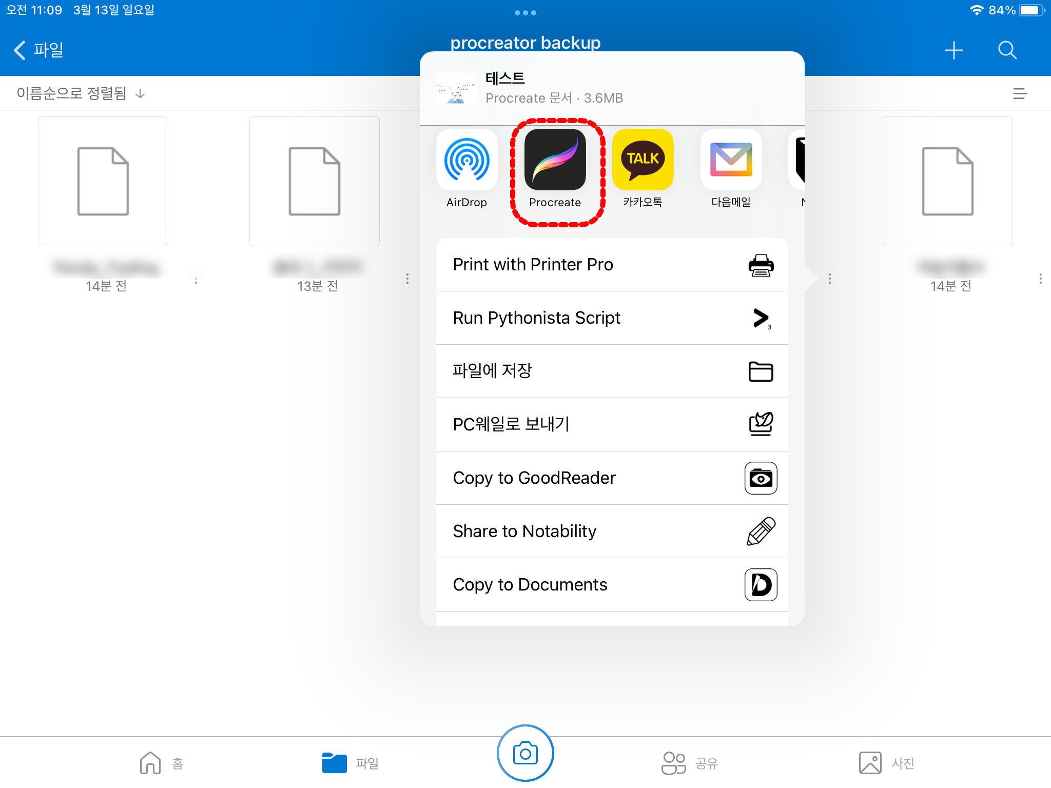 Procreate 앱을 선택하며, 자동으로 백업파일이 Procrate로 전송됩니다.
