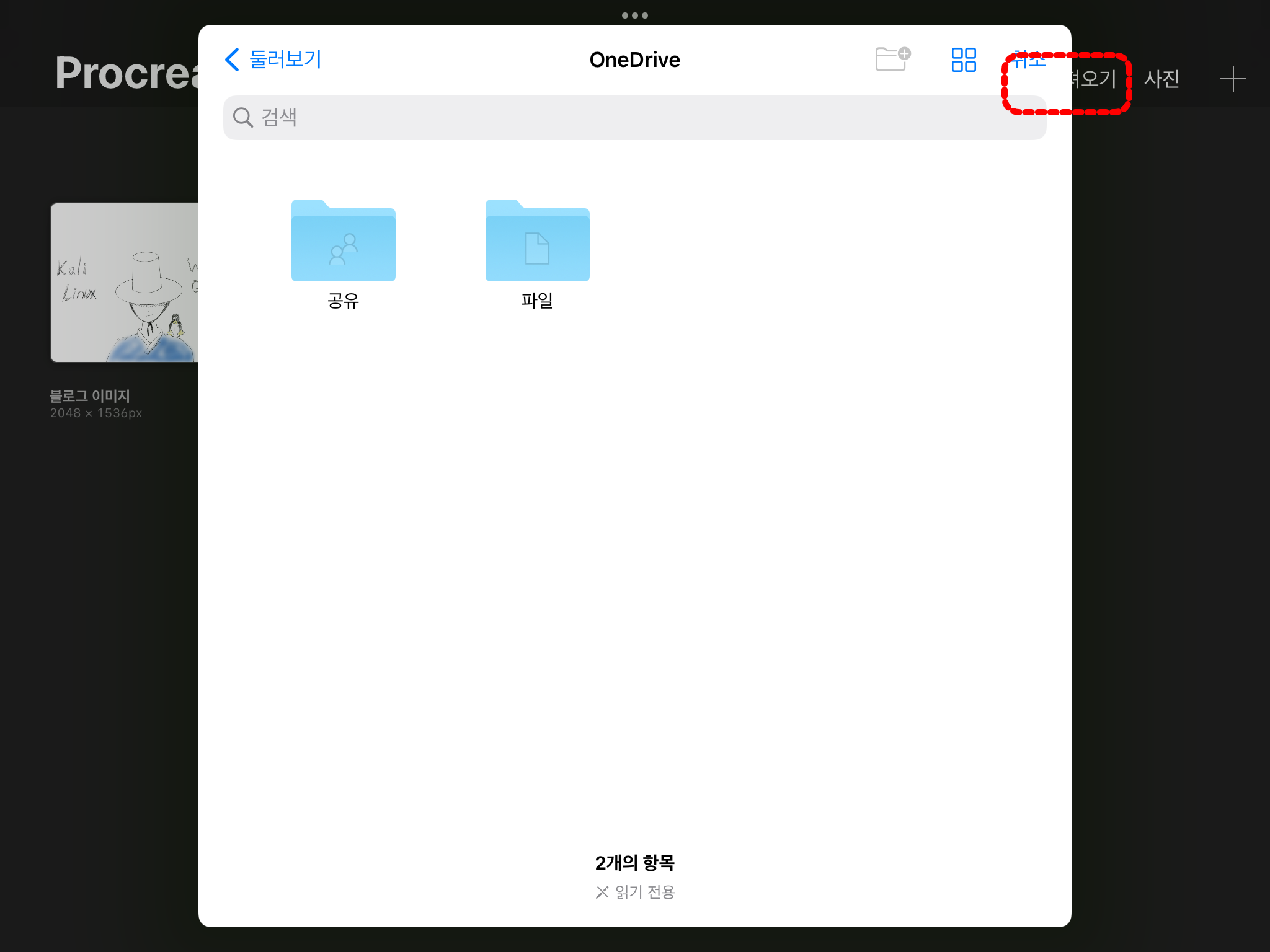 더 편한 방법으로 Procreate 앱 "가져오기" 메뉴를 사용하는 방법이 있습니다.