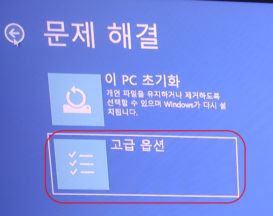 "문제 해결" 메뉴에서는 다시 "고급 옵션"을 선택합니다.