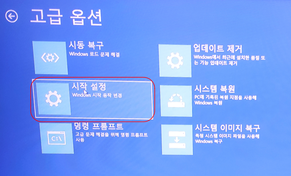 "고급 옵션"메뉴에는 "시동 복구", "업데이트 제거", "시스템 복원", "명령 프롬프트", "시스템 이미지 복구"를 추가로 이용할 수 있습니다.