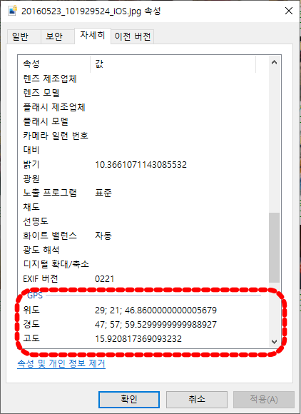 윈도우에서 파일 - 속성 - 자세히에서 GPS 정보를 확인할 수 있습니다.