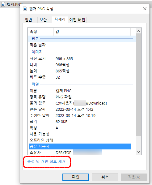 입력된 정보를 직접 변경하거나 "속성 및 개인 정보 제거"를 눌러서 제거된 파일을 생성할 수 있습니다.