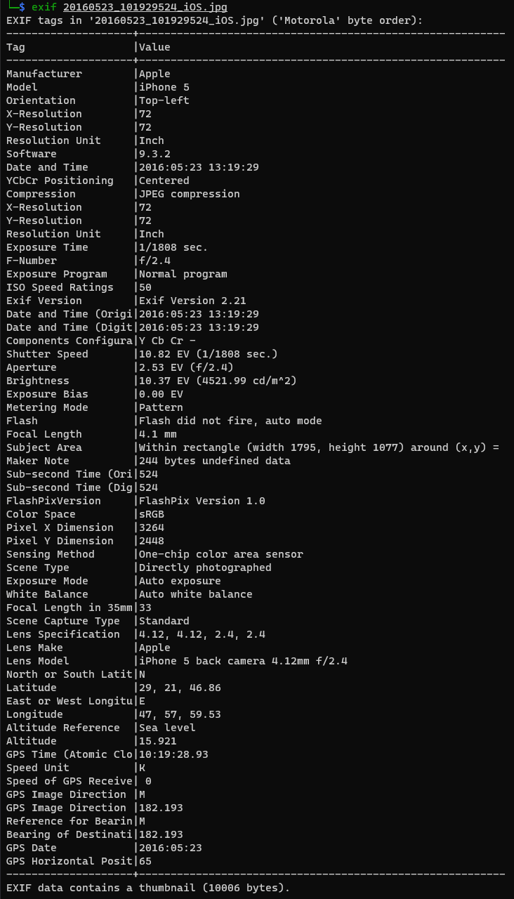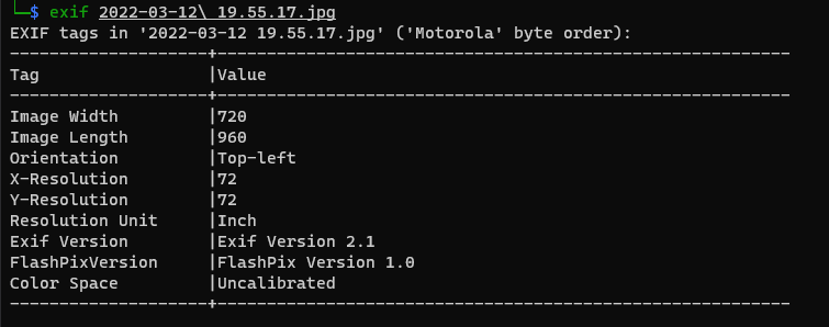 EXIF 정보를 확인하기 위해서는 간단히 exif 사진 파일명을 입력하면 확인할 수 있습니다.