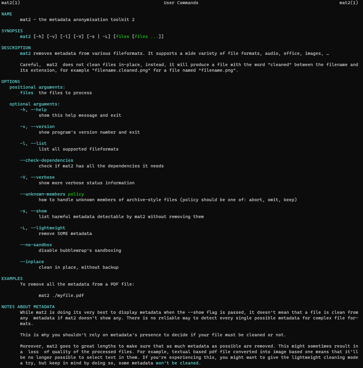 man mat2 명령어를 실행하면 mat2 관련한 Manual(man page)를 확인할 수 있습니다.