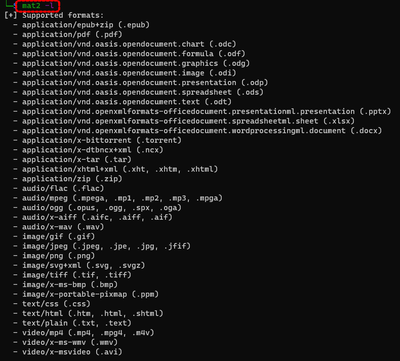 mat2 -l 명령어로 all supported fileformats을 확인할 수 있습니다.