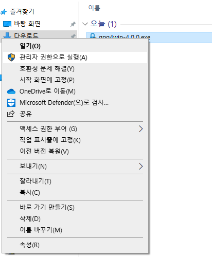 바이러스 검사를 완료하고 탐색기에서 gpg4win 파일 위에서 '마우스 오른쪽 클릭'을 하고 "관리자 권한으로 실행"을 선택합니다.