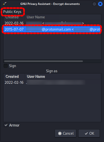 메일 내용을 다 작성하고 Encrypt 버튼을 누르면 Public keys에 암호화에 사용할 Key를 선택하게 됩니다.