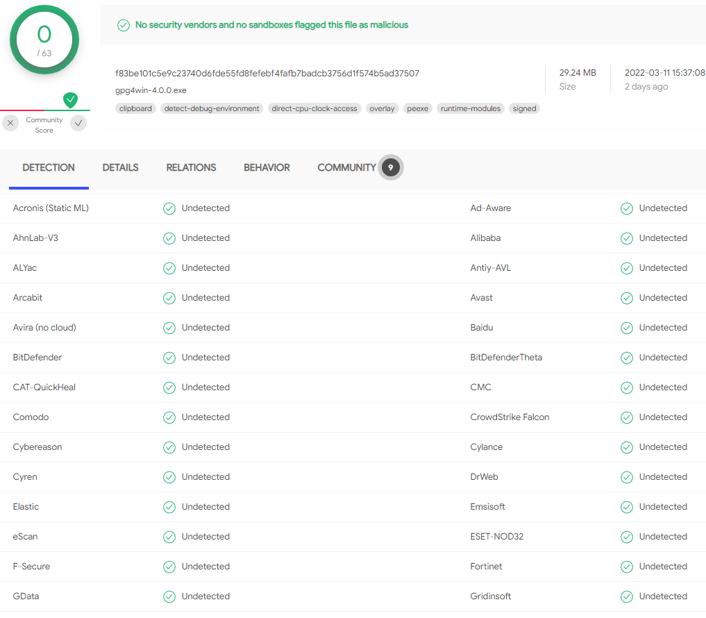 모든 백신 엔진에서 Undetected로 표시된 안전한 파일임을 확인할 수 있습니다.