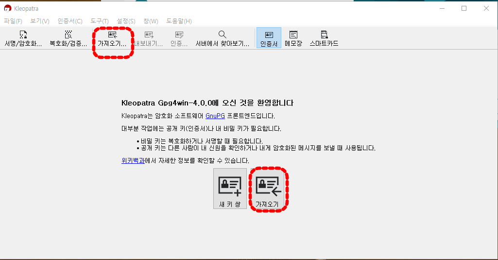 설치하신 gpg4win의 Kleopatra와 다르다고 놀라진 마세요.