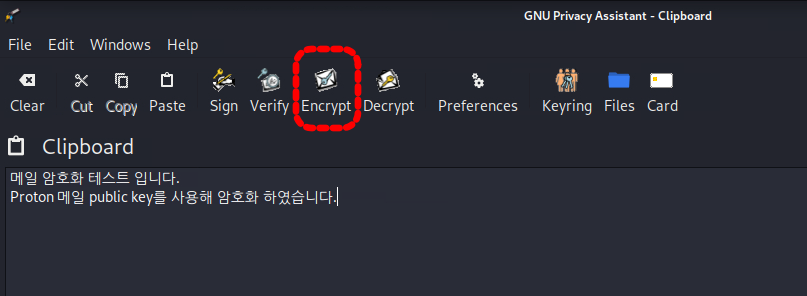 암호화 키를 Kleopatra에 가져오기 한 이후에 Clipboard에서 메시지를 작성하고 Encrypt 버튼을 누르시면 됩니다.