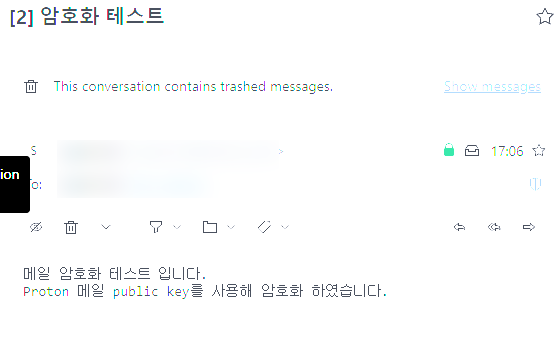 ProtonMail 계정에는 Private Key/public key, key pairs가 있기 때문에 암호화된 메시지를 받으면 ProtonMail에서 자동으로 복호화를 합니다.