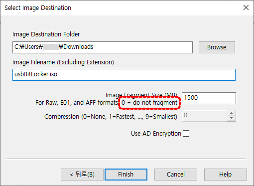 Image Fragment Size(MB)는 기본으로 "1500"이 입력된 상태인데, Image 파일을 생성할 때 각가 1500MB씩 분할해서 001, 002, ... 이런 식으로 분할해서 생성한다는 의미입니다.