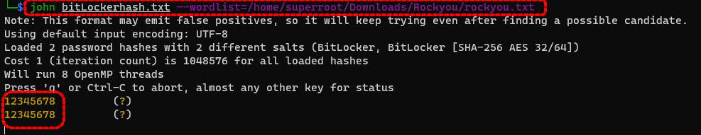 john의 사용법은 매우 간단한데요, john bitLockerhash.txt --wordlist="사전 파일 경로 및 파일명"을 입력하시면 사전 파일에 수록된 유명한 비밀번호 리스트를 모두 bitlocker 용 hash(SHA-256 AES 32/64)로 변환하여 비교해 보고 match가 있으면 비밀번호로 표시해 줍니다.