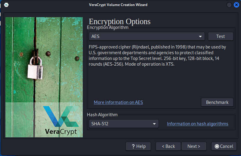 암호화 디스크 Volume (Encrypted file container)에 적용될 암호화 알고리즘을 선택합니다. 기본적으로 "AES"로 선택되어 있습니다. 그대로 진행하시면 됩니다.