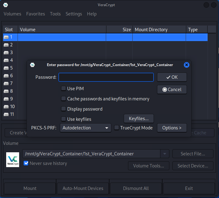 이제 생성한 암호화 디스크 Volume을 Slot(리눅스), Drive(윈도)에 Mount 시켜주시면 Mount된 디스크에 파일이나 폴더를 저장시킬 수 있습니다.