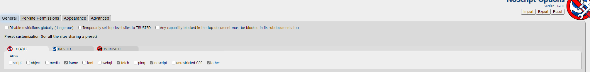 NoScript 옵션(Per-site Permissions)