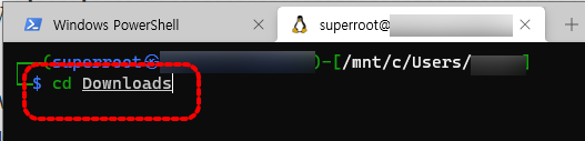 WSL2, Kali Linux Terminal을 실행하고 cd Downloads 명령어를 실행하면, 다운로드 폴더로 이동이 됩니다.