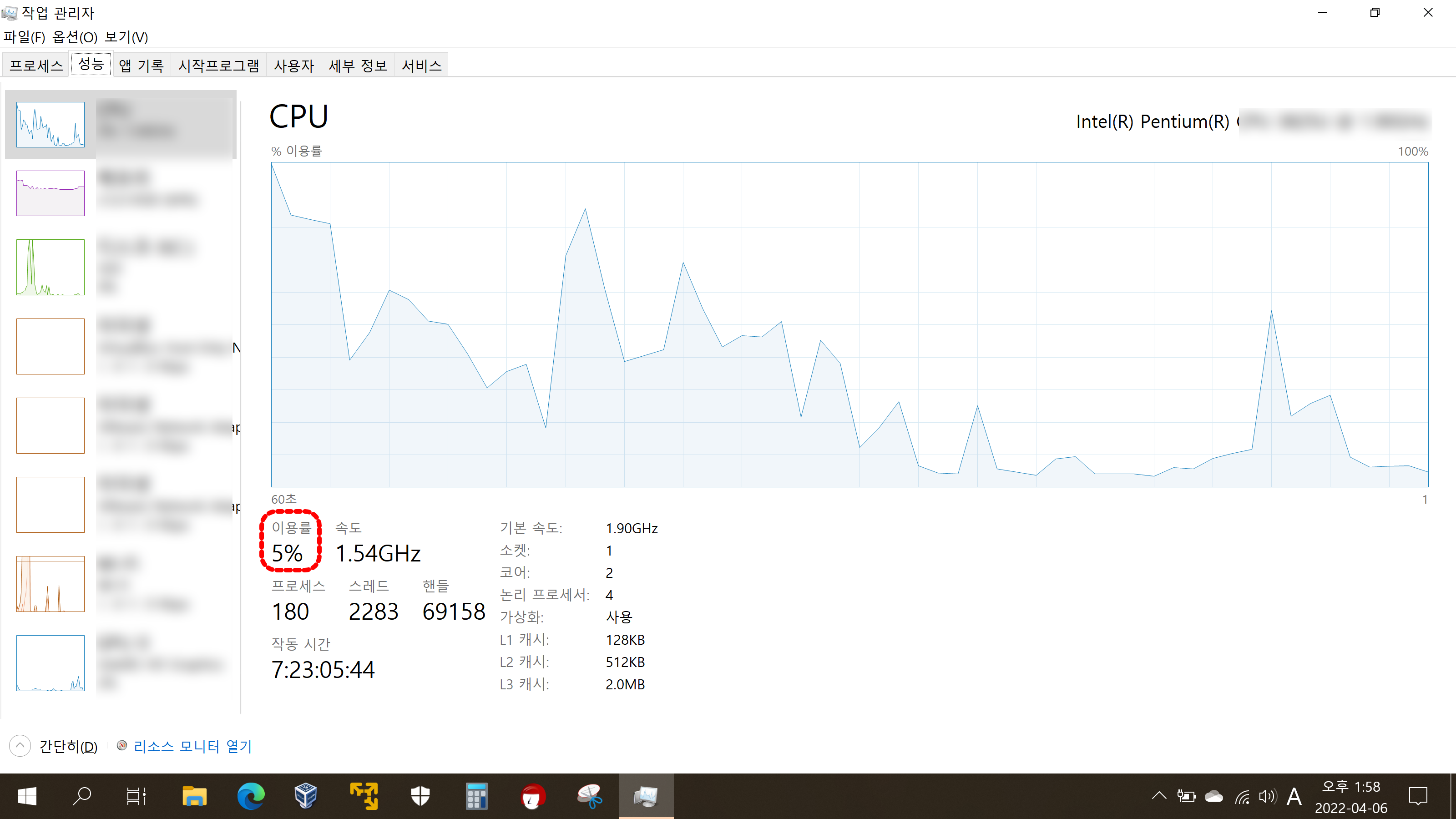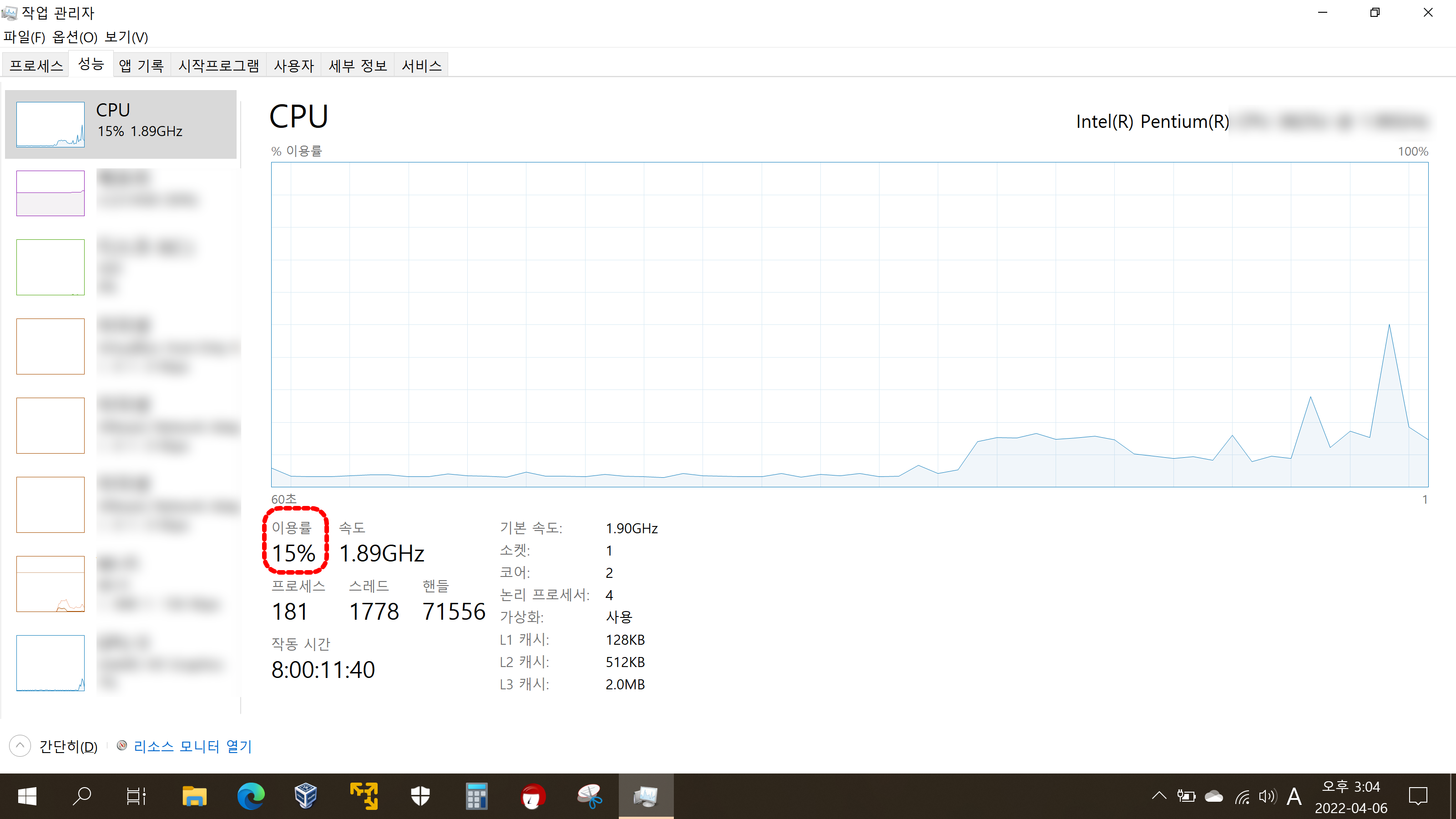 노트북의 CPU 이용률이 4~15% 정도 다소 올라갔는데요, 디도스(DDoS) 공격의 영향보다는 자체적인 서비스에 의한 자연적인 CPU 이용률 상승으로 보여집니다.