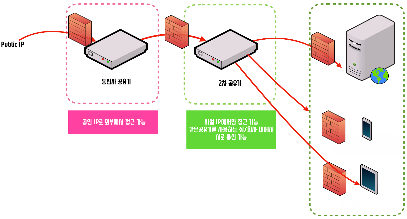 공유기에 연결된 장비들은 공유기의 DHCP SERVER로부터 사설 IP(Private IP)를 부여받아서 인터넷을 사용하게 되는데요, 외부에서는 이런 사설 IP(Private IP)에 직접적으로 접근할 수 없습니다.