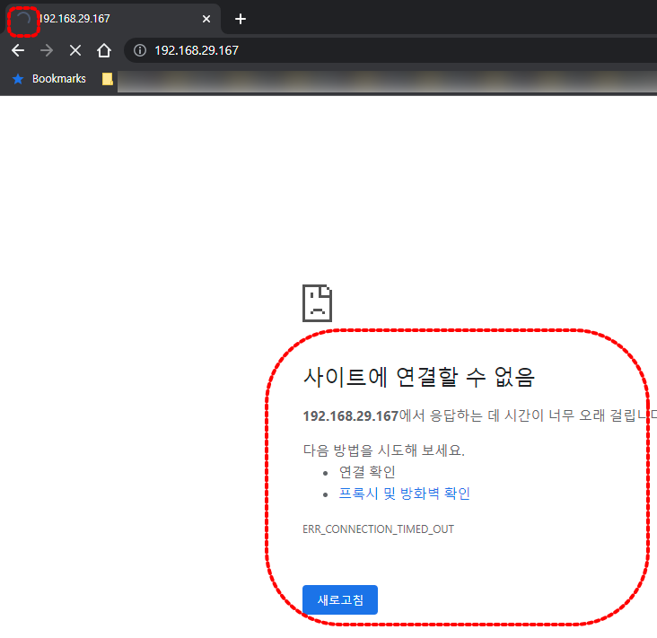 브라우저에서 다시 해당 서버에 접속해 보면 브라우저 좌측 상단에 빙빙 도는 아이콘과 "사이트에 연결할 수 없음"이라는 메시지를 볼 수 있습니다.