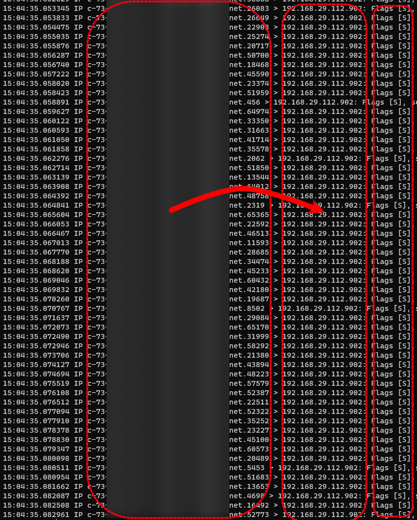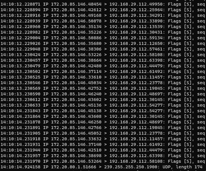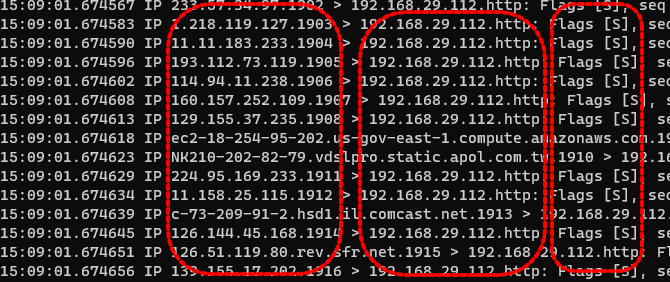디도스(DDoS) 공격 중에 패킷을 TCP DUMP를 통해서 살펴보면, Flags [S], 즉 SYN 패킷만 목적지로 보내고 있음을 확인할 수 있습니다.