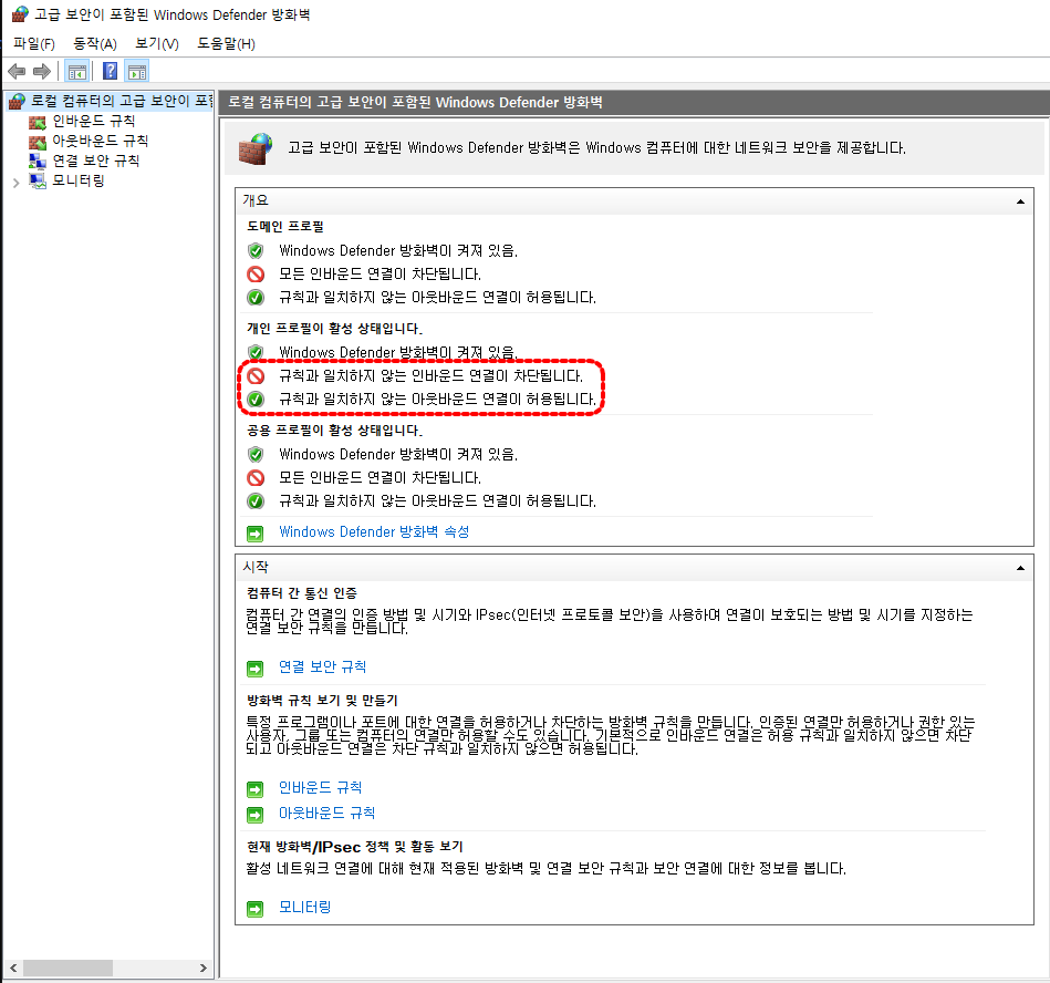 방화벽에는 크게 2부분으로 규칙이 설정되어 있습니다.