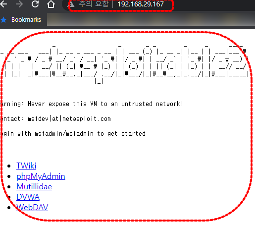 VMWare에 설치된 취약 서버를 작동시키고 웹 브라우저에서 해당 서버의 웹 페이지에 접속한 모습입니다.