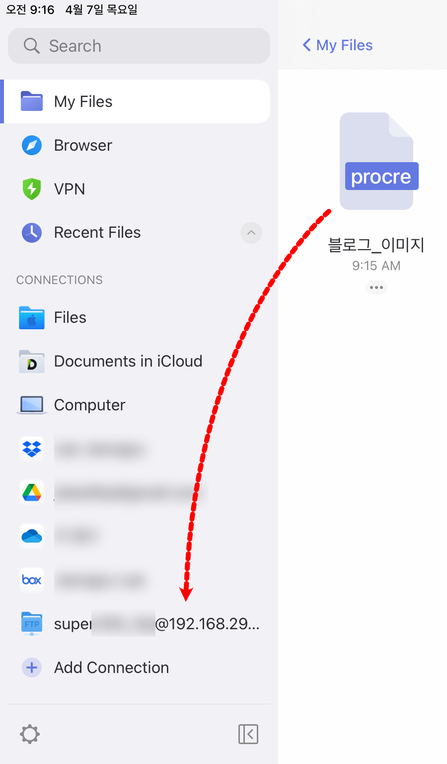 FTP 서버 설정이 완료된 Documents 앱을 이용해 "블로그이미지.procreate" 파일을 전송해 보았습니다.