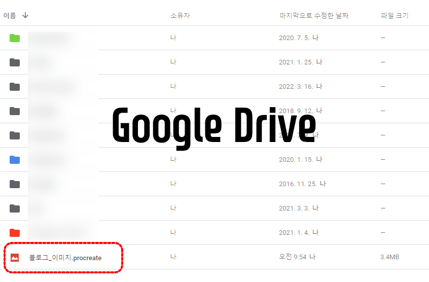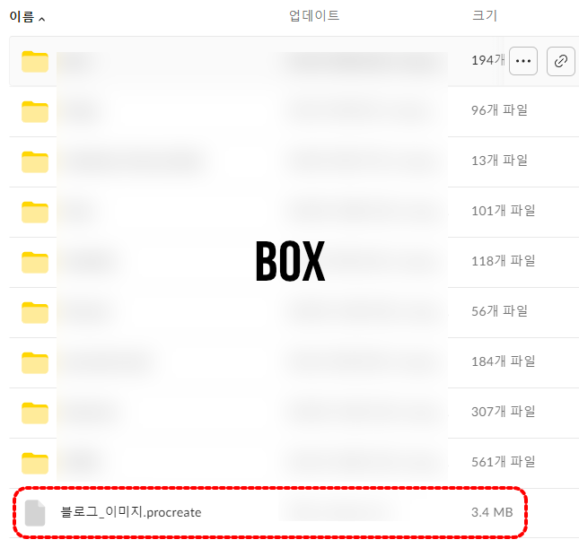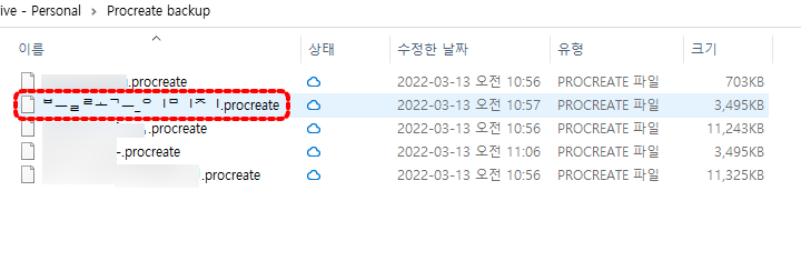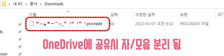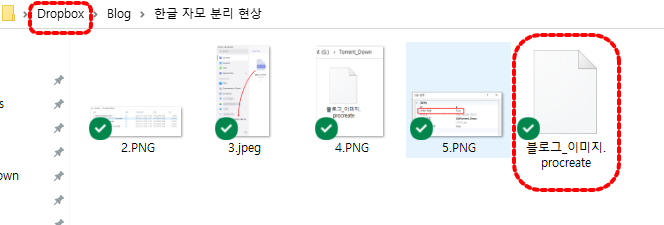 아이패드 Procreate 앱에서 자체 공유 기능을 통해서 Dropbox로 전송해 보았습니다. 한글 자모음 분리현상 없음.