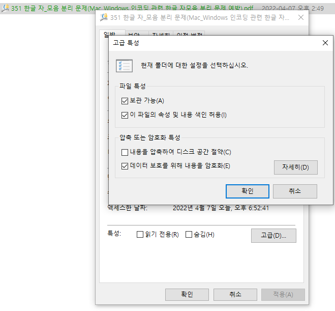 폴더를 이렇게 EFS 암호화 속성을 지정해 주면, 그 폴더에 추가하는 모든 파일 역시 자동으로 EFS 암호화 특성이 반영됩니다.