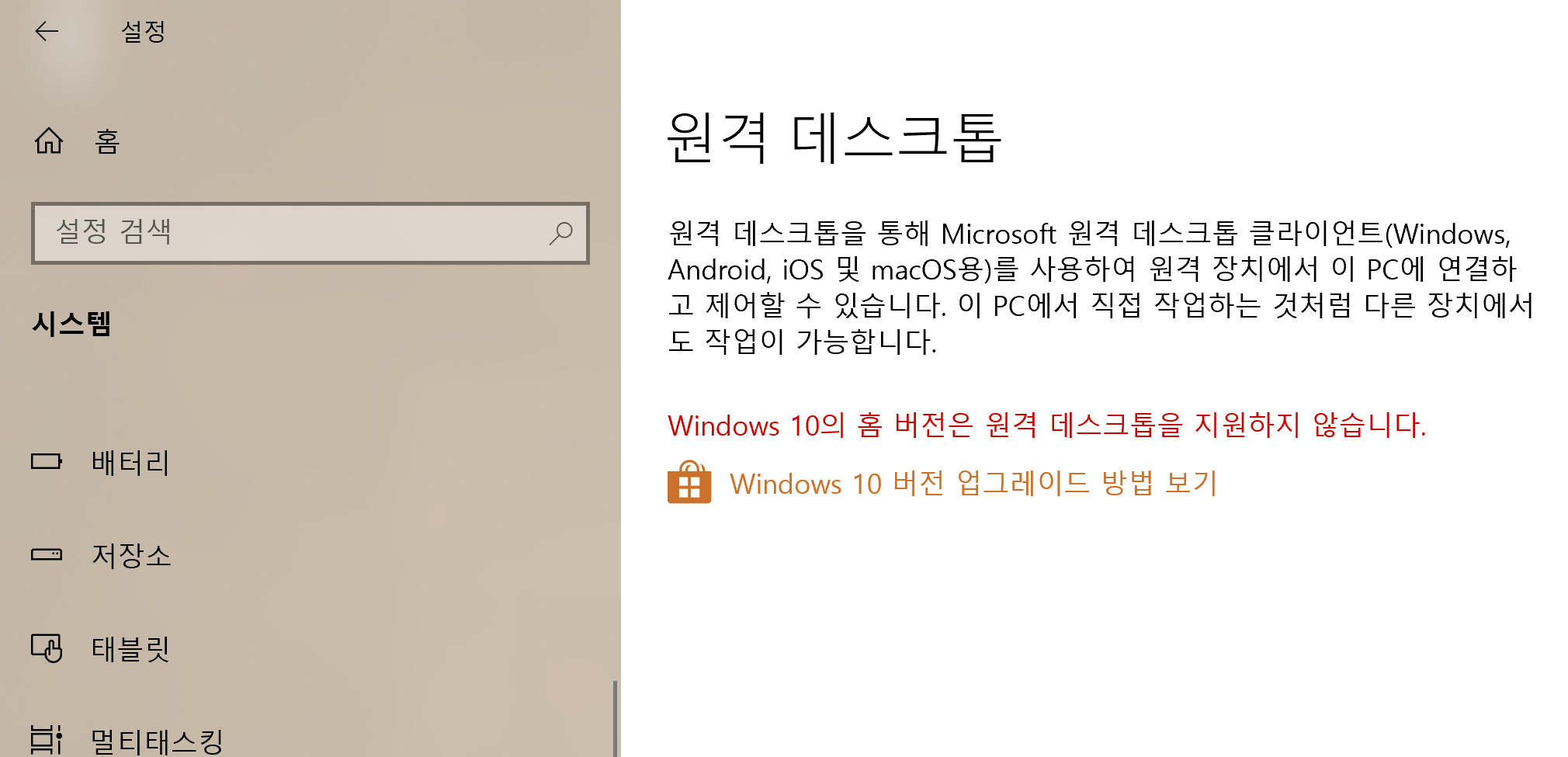 Windows Home 버전에서는 이런 Windows 자체 원격 데스크톱 기능을 사용할 수 없습니다.