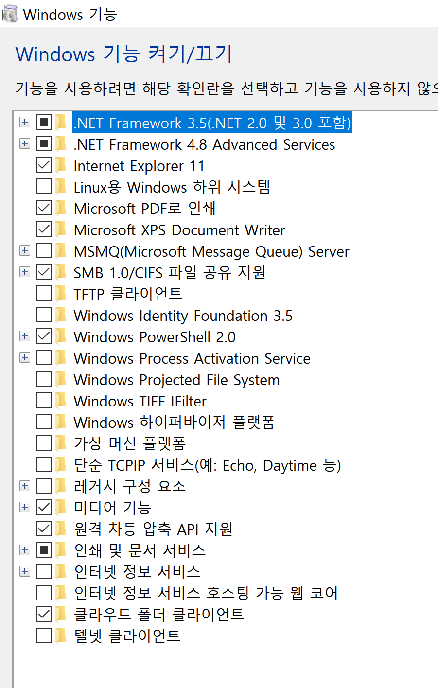 [검색] 메뉴에서 "Windows 기능 켜기/끄기"를 입력해서 이 메뉴를 사용할 수 있습니다.