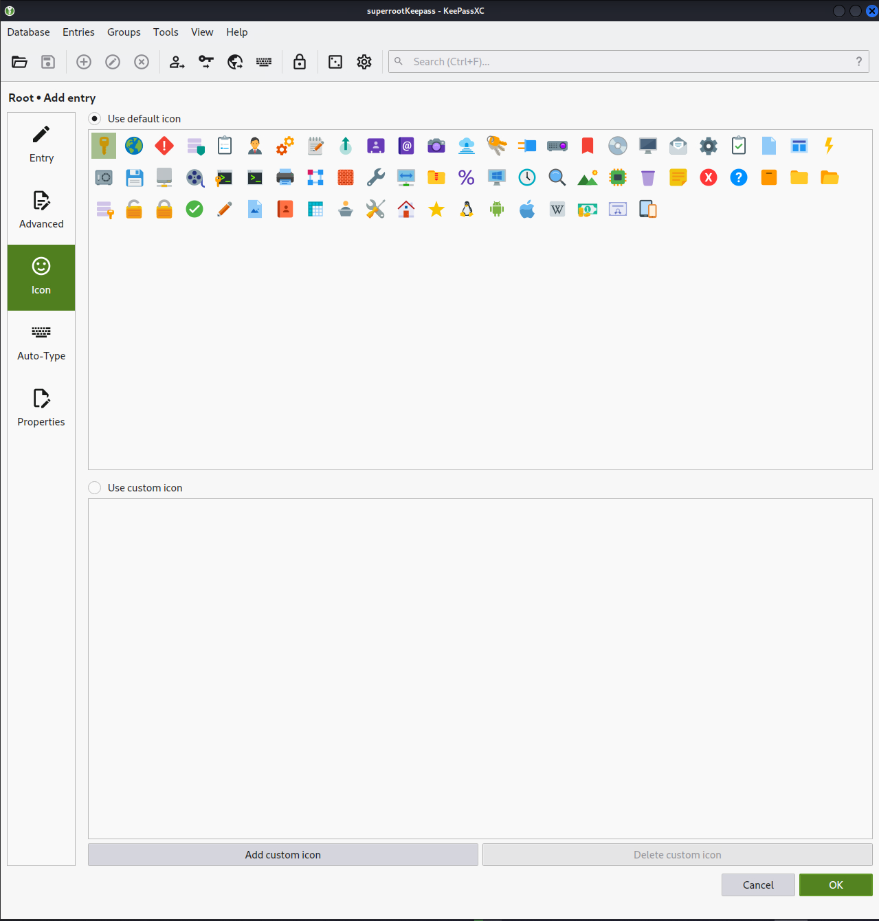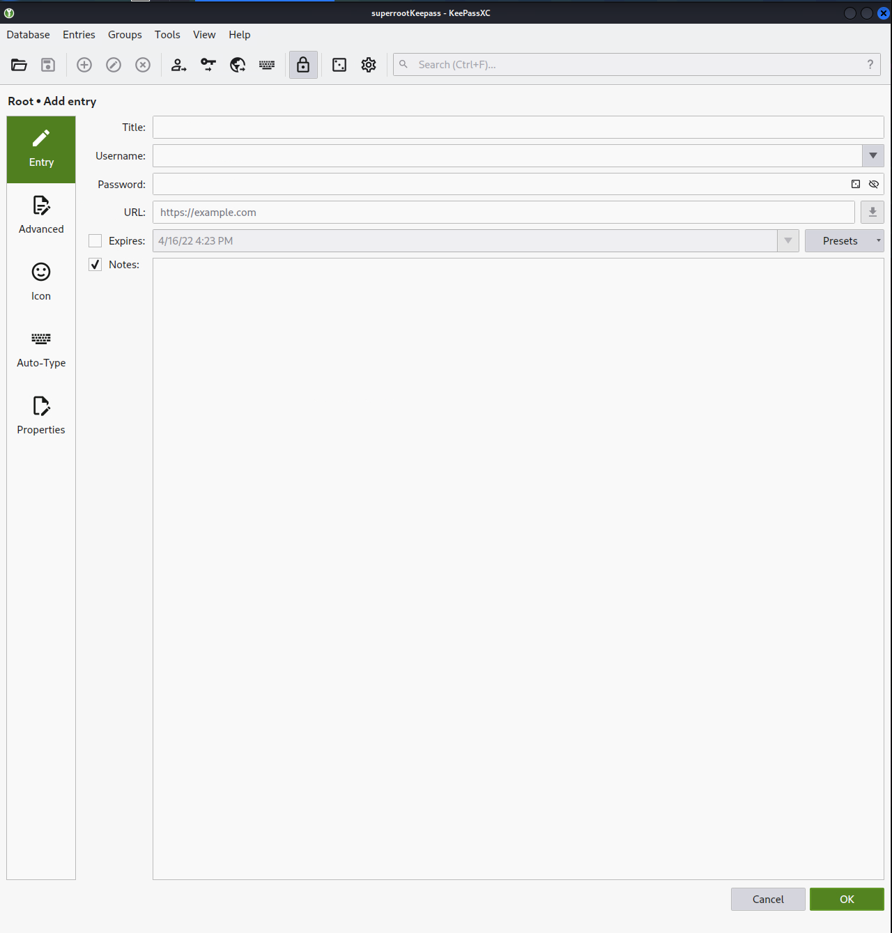 Username, Password, URL, Notes 관련 Entry가 기본 입력할 수 있는 정보이며, Advanced, Icon 등의 메뉴를 사용하여 추가적인 정보도 보관할 수 있습니다.
