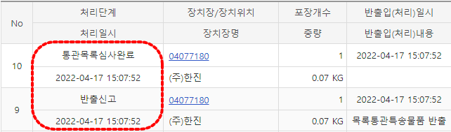 "통관목록심사완료", "반출신고"가 보이시면 통관이 모두 완료된 상태이며 물품은 국내 택배사로 이동하게 됩니다.
