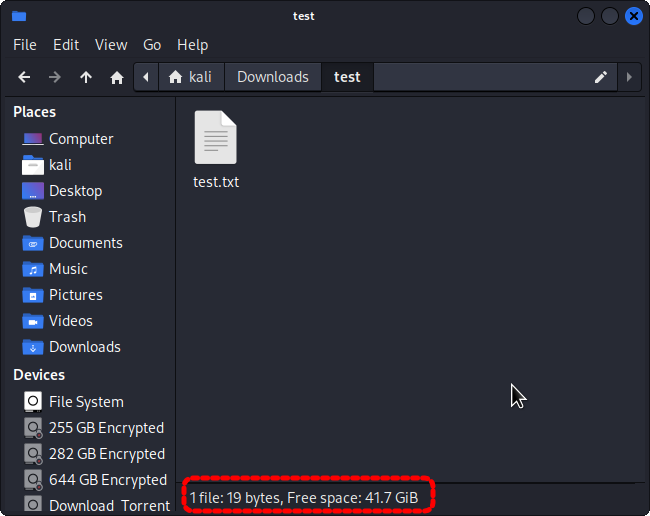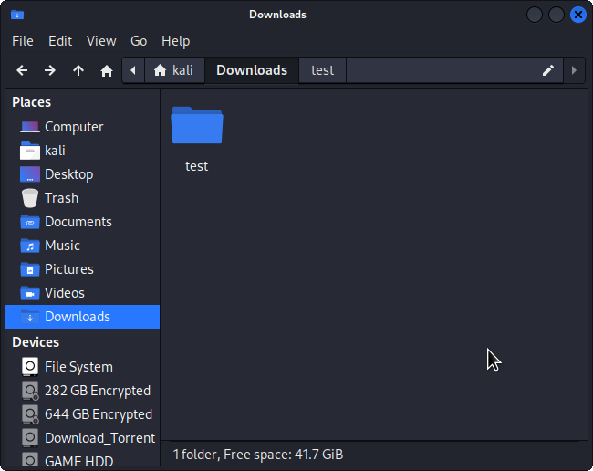 Downloads 폴더에 "test'라는 폴더와 그 내부에 "test.txt"라는 파일을 생성했습니다.