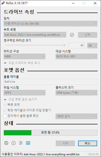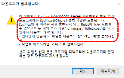 Rufus에서 ldlinux.sys, ldlinux.bss 파일을 추가로 다운로드해 설치하기 때문에 Kali Linux Live USB를 생성할 때에는 인터넷에 연결되어 있어야 합니다.