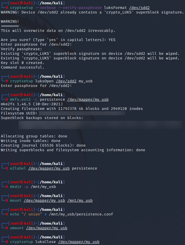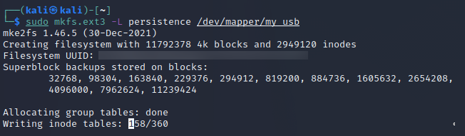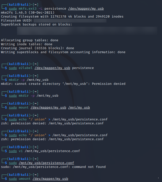 mkfs.ext3 -L persistence /dev/mapper/my_usb