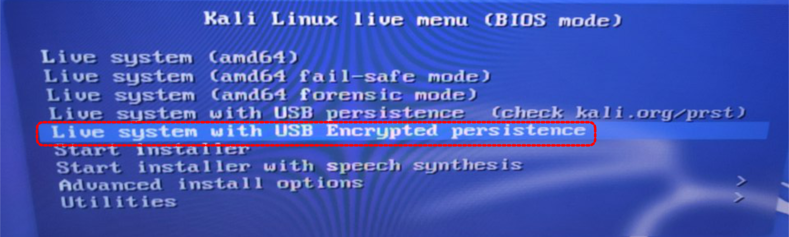 Kali USB 부팅메뉴에서 "Live system with USB Encrypted persistence" 메뉴를 선택하면 우리가 만들어준 Persistence storage가 연결된 상태로 Kali Linux가 실행됩니다.