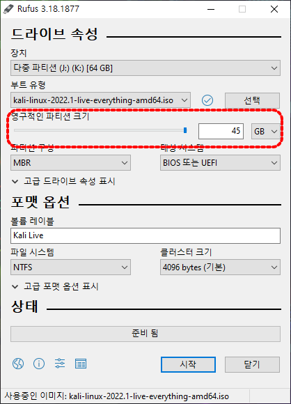 제 경우 kali linux live everything-amd64.iso 이미지, USB 64GB를 사용해서 첫 번째 파티션에 Kali Linux를 설치하고 남는 45GB(두 번째 파티션)의 모든 용량을 persistent storage용량으로 할당해줬습니다.