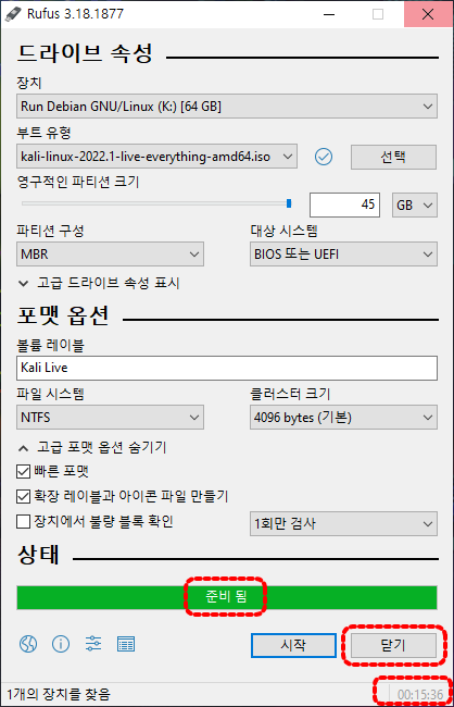 진행 상태에 "준비 됨"으로 표시된 상태가 완료된 상태입니다. "닫기"를 눌러서 종료합니다.