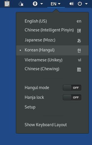Tails 운영체제에서는 기본적으로 Korean(Hangul) 입력을 지원합니다. 입력기를 Korean(Hangul)로 선택하고 Shift + Space 키를 누르면 "한글" - "영문"이 토글 됩니다.
