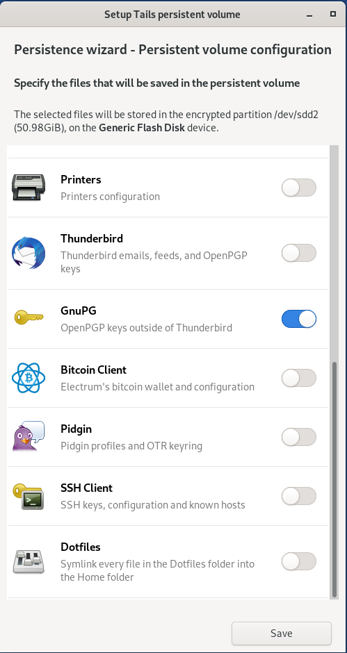 USB에 Tails를 설치하고, USB의 남은 공간을 Persistent Volume으로 생성하고, 그 내부에 Personal Data, Wifi 연결 정보, GnuPG Keypairs, ssh key등을 보관할 수 있습니다.
