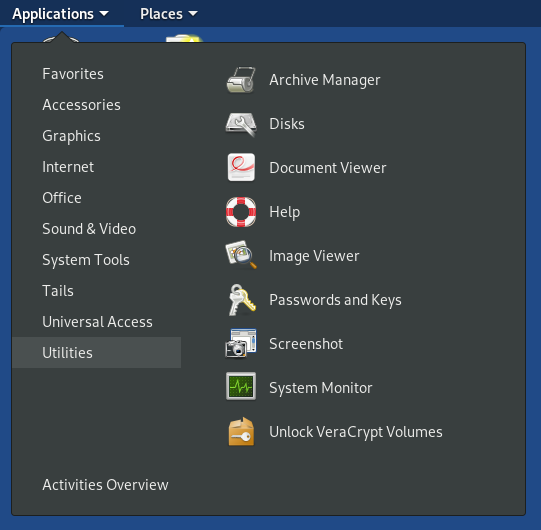 Utilites 메뉴에는 압축 관련, 디스크 관련, Document Viewer, Image Viewer, Screenshot, Passwords and Keys 관리 도구, VeraCrypt Volumes 마운트 할 수 있는 프로그램이 있습니다.