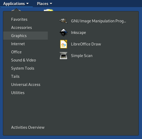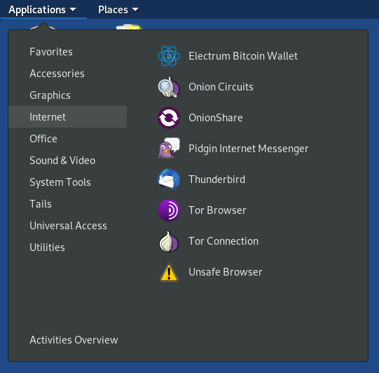 Tails 메뉴에는 Tails documentation, Tails Installer 등이 있습니다.