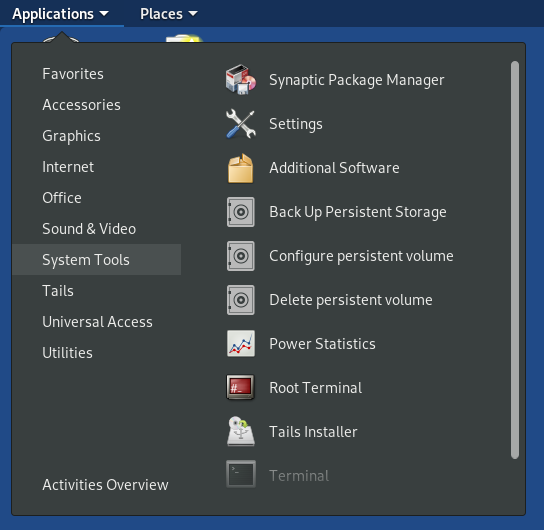 System Tools에는 추가 프로그램을 설치, 관리할 수 있는 Additional Software, Synaptic Package Manager, 암호화된 persistent Storage를 관리할 수 있는 Back Up, Configure, Delete 등의 메뉴가 있습니다.