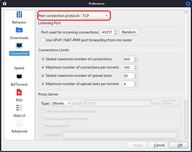 qBittorrent 환경설정 - Connection 메뉴 - Peer connection protocol: TCP로 바꿔줍니다.