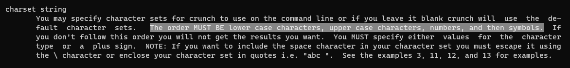 Example 4에 살펴보시면 crunch 1 8로 시작하는데, wordlist 생성 시 1~8자리 wordlist를 생성하게 되며 사용하는 문자열(charset strings)은 crunch에 기본 탑재된 charset.lst의 mixalpha-numeric-all-space에 입력된 문자열을 사용한다는 의미입니다.