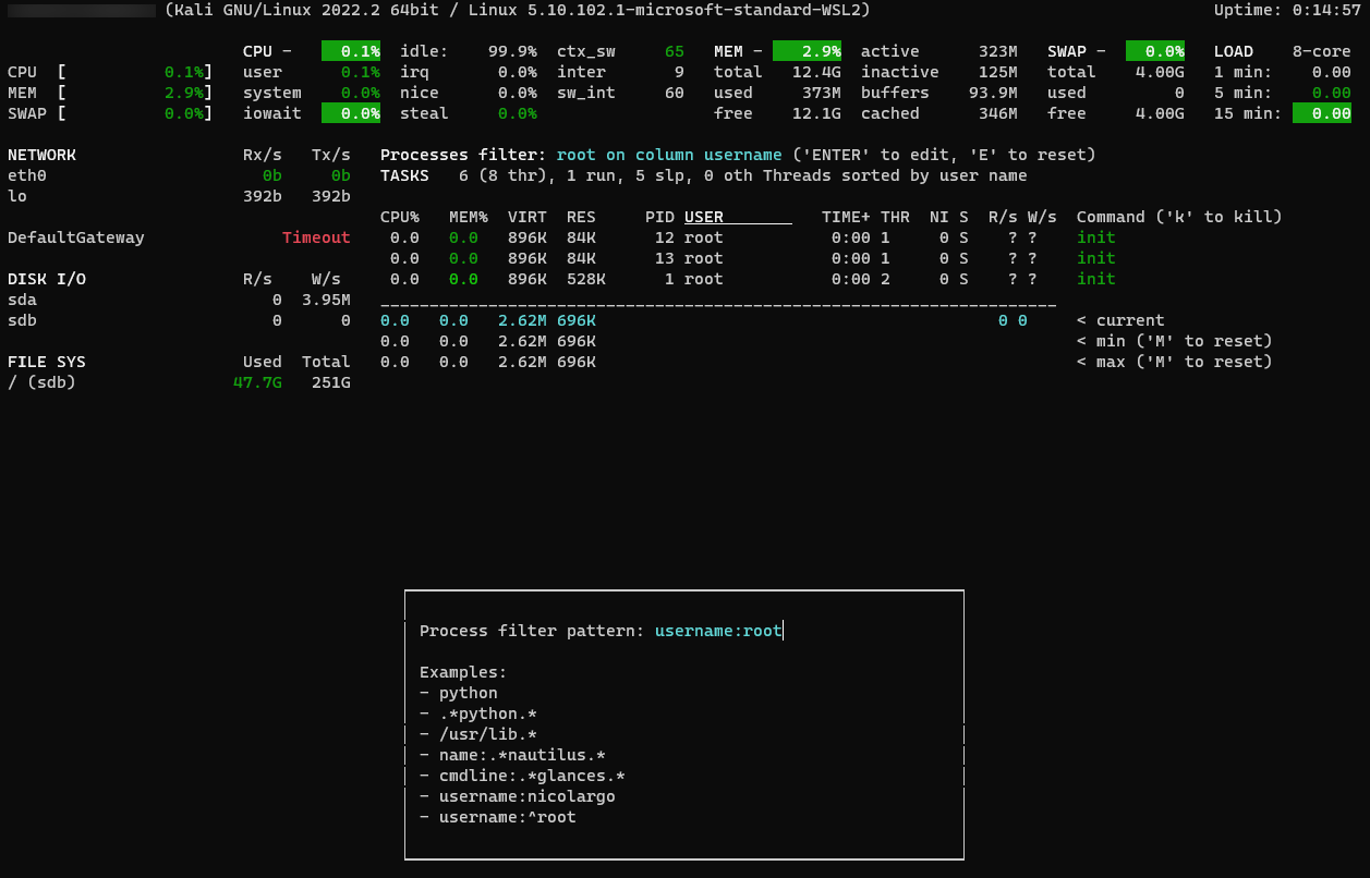 glances에는 NETWORK traffic, DISK I/O와 같은 추가 정보를 확인할 수 있는 장점이 있습니다.