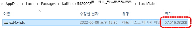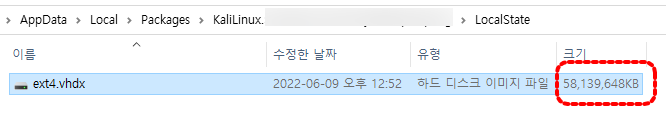 Kali Linux의 ext4.vhdx 용량이 많이 줄었음을 확인할 수 있습니다.