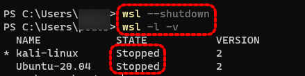 wsl -l -v 명령어를 입력해 보시면 State를 확인할 수 있습니다. Stopped 상태를 확인하시고 diskpart 명령어를 입력해 주세요.
